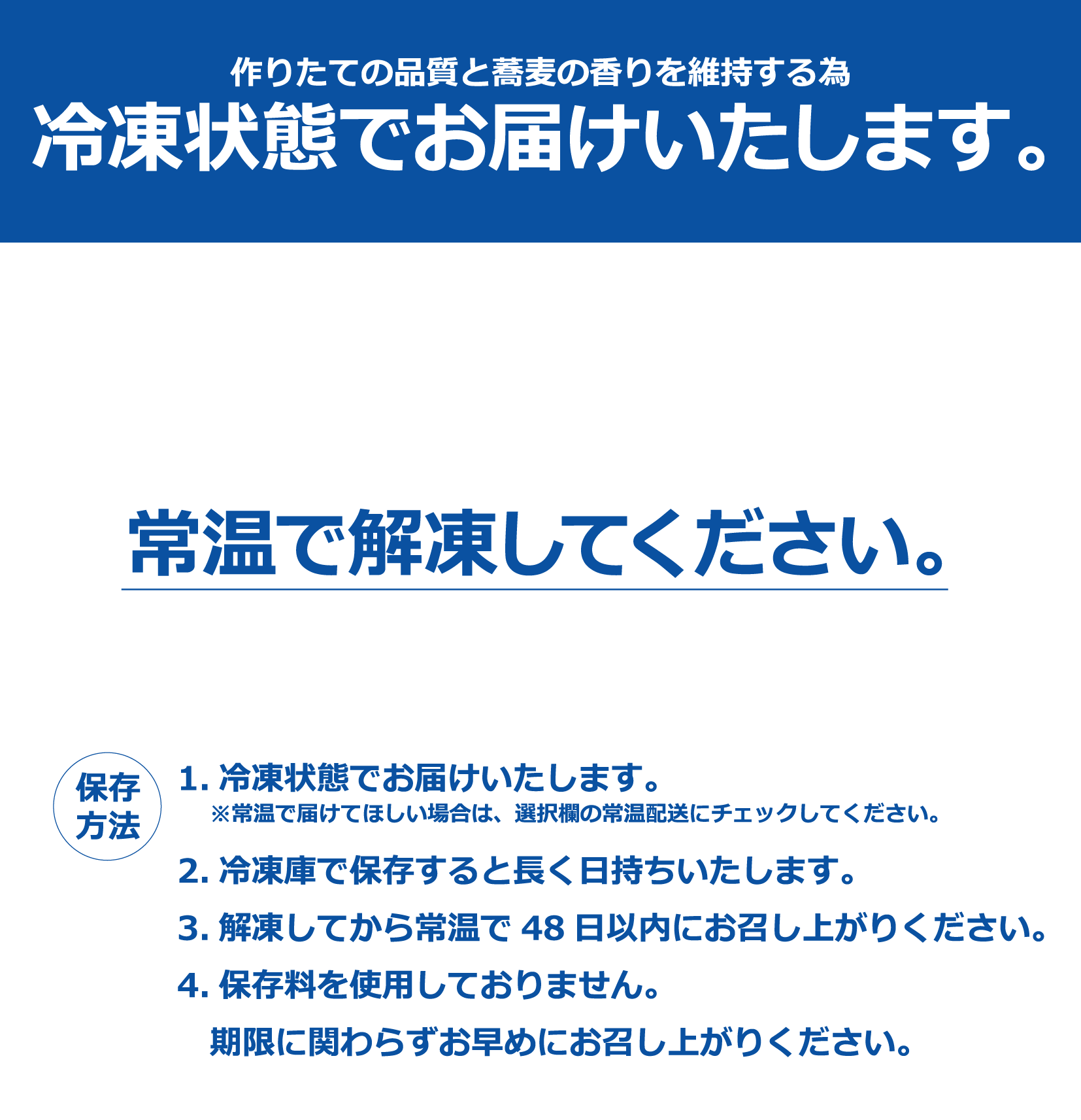 ・作りたての品質と蕎麦の風味を保つため冷凍便でお届けしております。