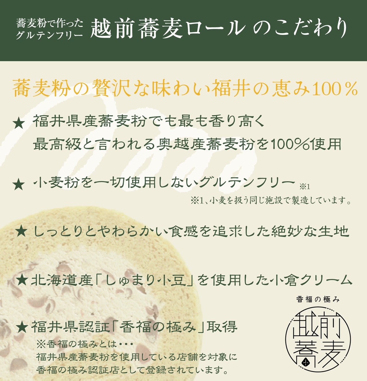 越前蕎麦ロールは、福井県産の蕎麦粉を100%使用した、ヘルシーでグルテンフリーなロールケーキです。独自の製法により、しっとりとした食感と蕎麦特有の風味が絶妙に融合した一品で、ほんのり感じるコクのある甘さがクセになります。手作り感のある優しいデザインは、ティータイムや特別な日のデザートにぴったり。自然の恵みを生かした贅沢な美味しさを、お楽しみください。このロールケーキは、身体に優しい素材を使っているため、健康志向の方にもおすすめです。