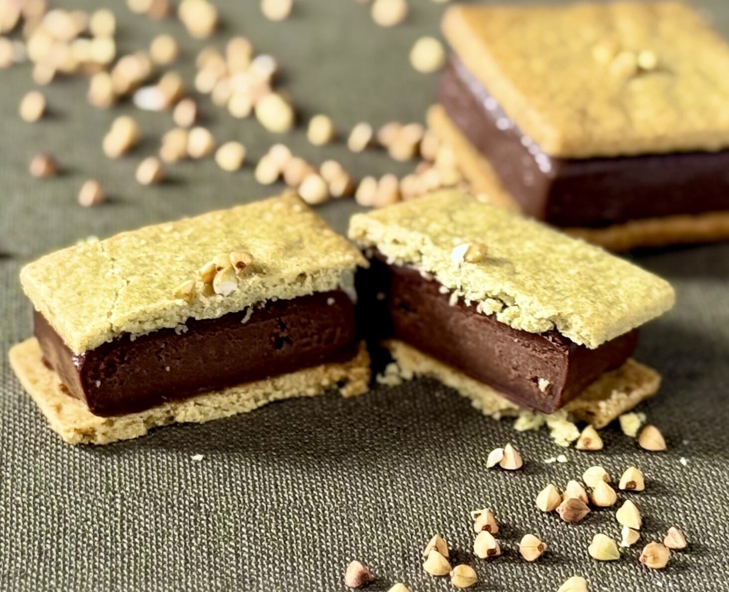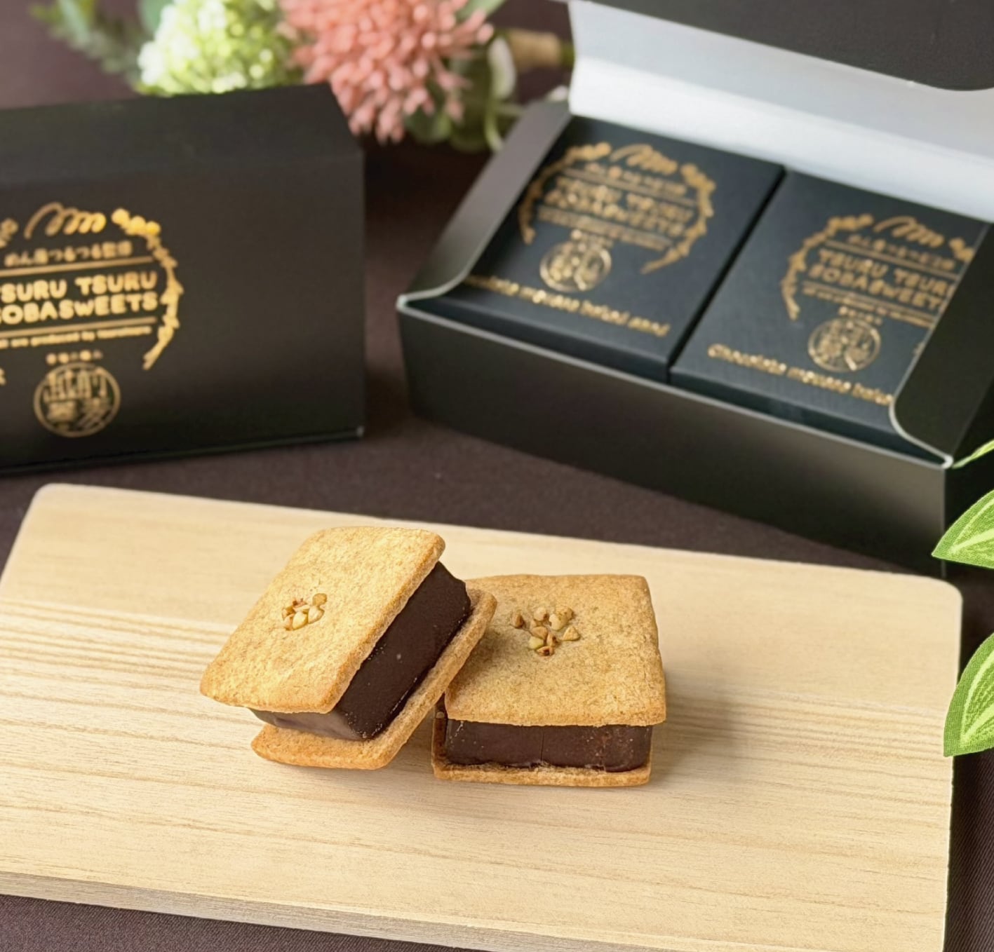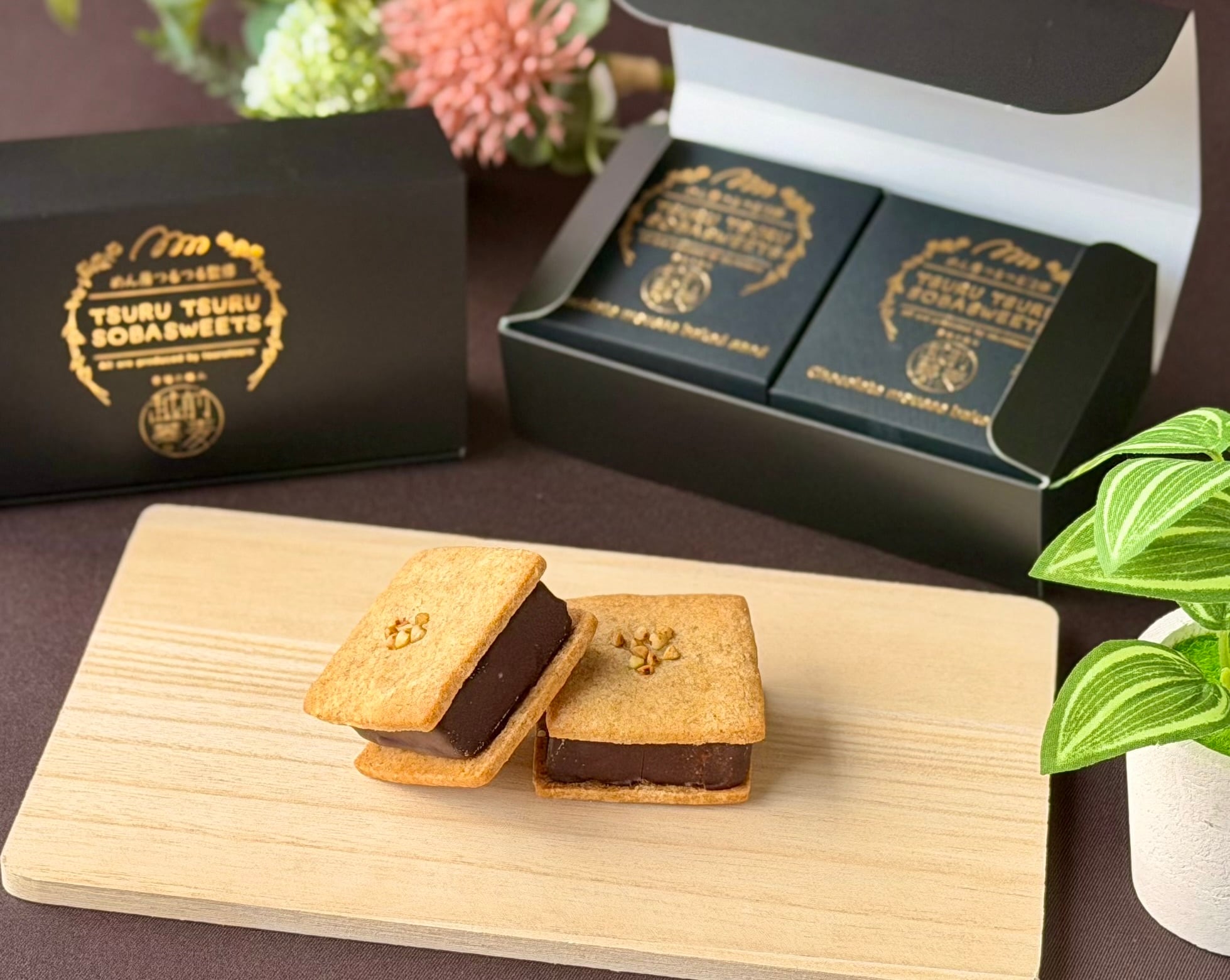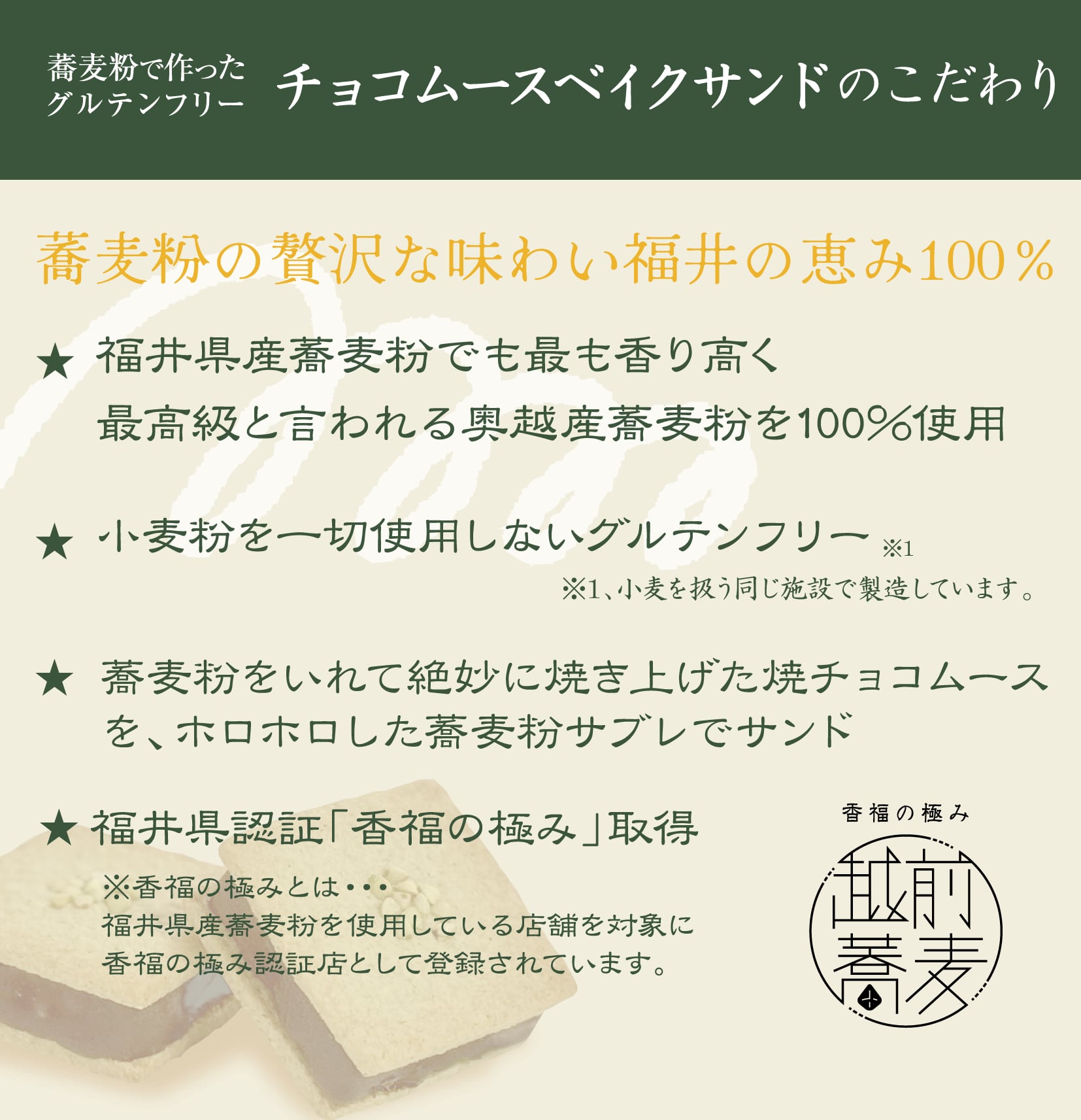 チョコムースベイクサンド は、福井県産蕎麦粉を使用したグルテンフリーのサブレで、蕎麦粉入りの焼きチョコムースをサンドした贅沢な大人スイーツです。サクッと香ばしいサブレと、濃厚なチョコムースの上品な甘さと香ばしさが絶妙にマッチ。特別なティータイムや贈り物にもぴったりの一品です。ひと口で広がる豊かな風味が、心を豊かにしてくれます。