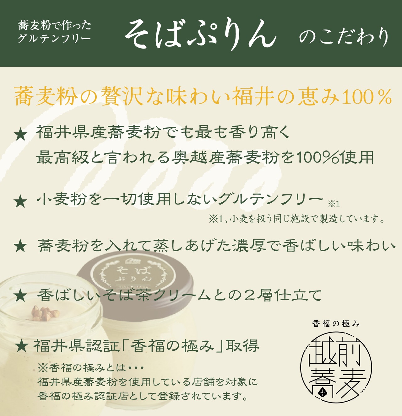 ・牛乳(国内製造)、乳等を主原料とする食品、加糖卵黄、きび砂糖、ホイップクリームミックス、蕎麦粉(福井県産)、そば茶、蕎麦甘皮粉(福井県産)、ゼラチン、蕎麦の実/トレハロース、糊料(加工でんぷん、増粘多糖類)、酸化防止剤(V.C)、香料、甘味料(スクラロース)、乳化剤、㏗調整剤、(一部にそば・卵・乳成分・大豆・ゼラチンを含む)